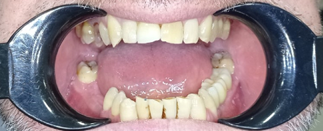 Отсутствие зубов на верхней и нижней челюстях. Затруднённое жевание, выраженный косметический дискомфорт.
