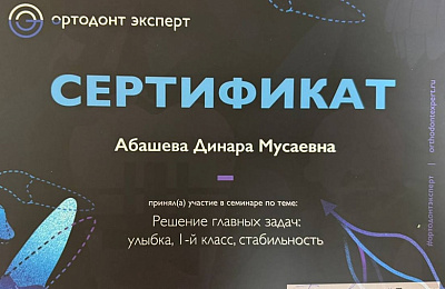 Абашева Динара Мусаевна -врач ортодонт ,занимающийся коррекцией неровного положения зубов и лечением неправильного прикуса преимущественно подростков и взрослых ,ежегодно совершенствуя свои навыки ,посещая множество семинаров и мастер -классов у топовых ортодонтов Москвы и Санкт-Петербурга.