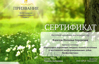 Наталья Сергеевна знает как найти подход как к детям разного возраста, так и к родителям. Умеет превратить процесс лечения в игру. Специализируется на эндодонтии зубов с несформированным корнем, лечении корней зубов у детей в сменном прикусе.